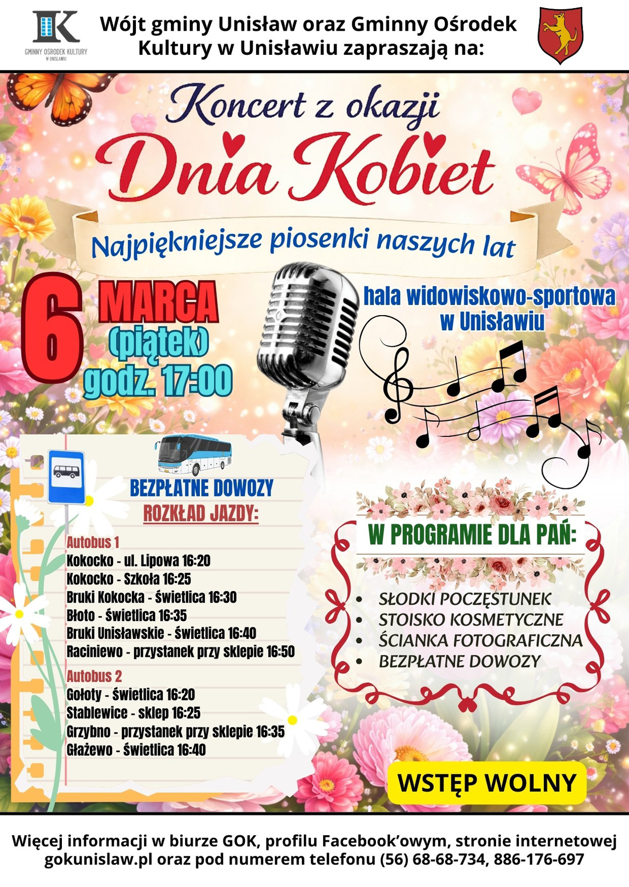 Wójt gminy Unisław Jakub Danielewicz oraz Gminny Ośrodek Kultury w Unisławiu serdecznie zapraszają na koncert z okazji Dnia Kobiet pt. „Najpiękniejsze piosenki naszych lat” dedykowany wszystkim mieszkankom gminy, który odbędzie się 6 marca (piątek) o godz. 17:00 w hali widowiskowo-sportowej w Unisławiu.