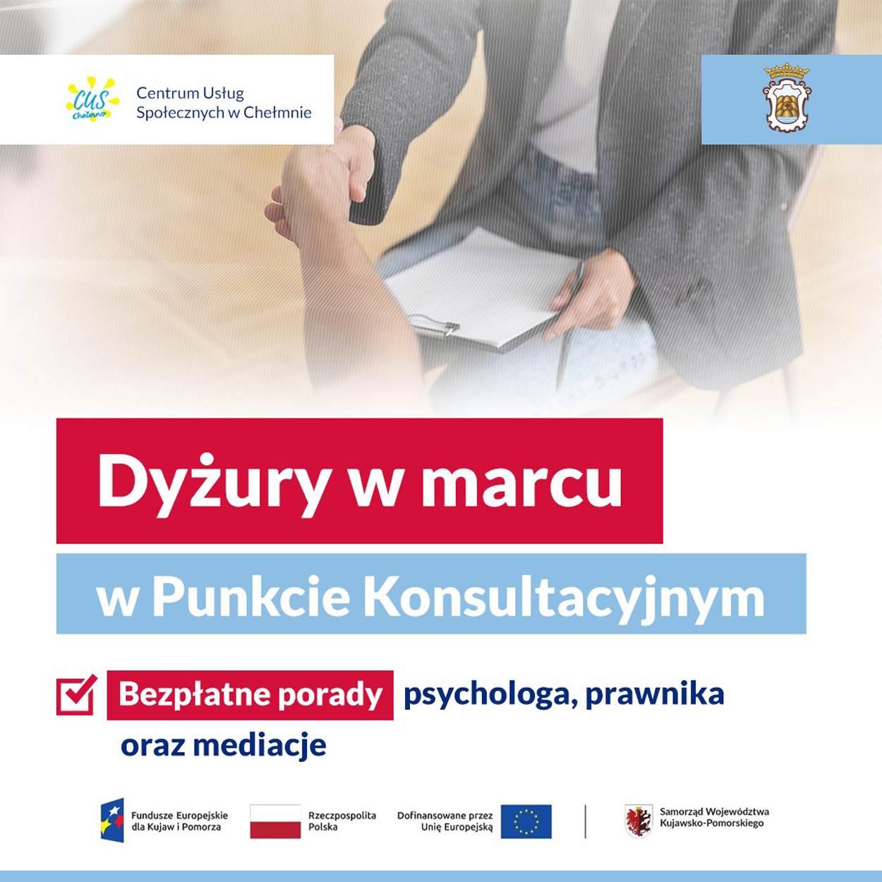 Potrzebujesz wsparcia psychologa, prawnika lub pomocy w rozwiązaniu konfliktu? Centrum Usług Społecznych w Chełmnie dawniej MOPS zaprasza mieszkańców do skorzystania z bezpłatnych porad w Punkcie Konsultacyjnym, ul. Hallera 11.