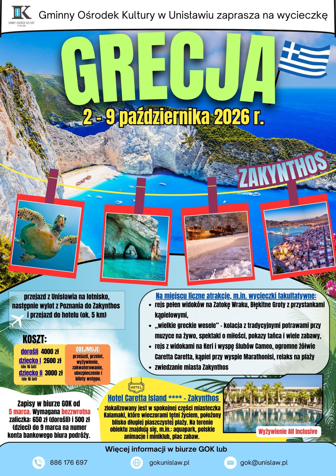 Gminny Ośrodek Kultury w Unisławiu serdecznie zaprasza mieszkańców gminy Unisław na wyjątkową podróż samolotem, tym razem do Grecji. Wyprawa na południe Europy odbędzie się w dniach 2 – 9 października 2026 r.