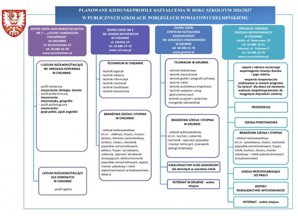 Tym, którzy szukają przyjaznej, kształcącej nowocześnie i z pasją, szkoły dla siebie polecamy uwadze bogaty wybór kierunków i profili kształcenia w roku szkolnym 2026/2027 w publicznych szkołach podległych Powiatowi Chełmińskiemu: