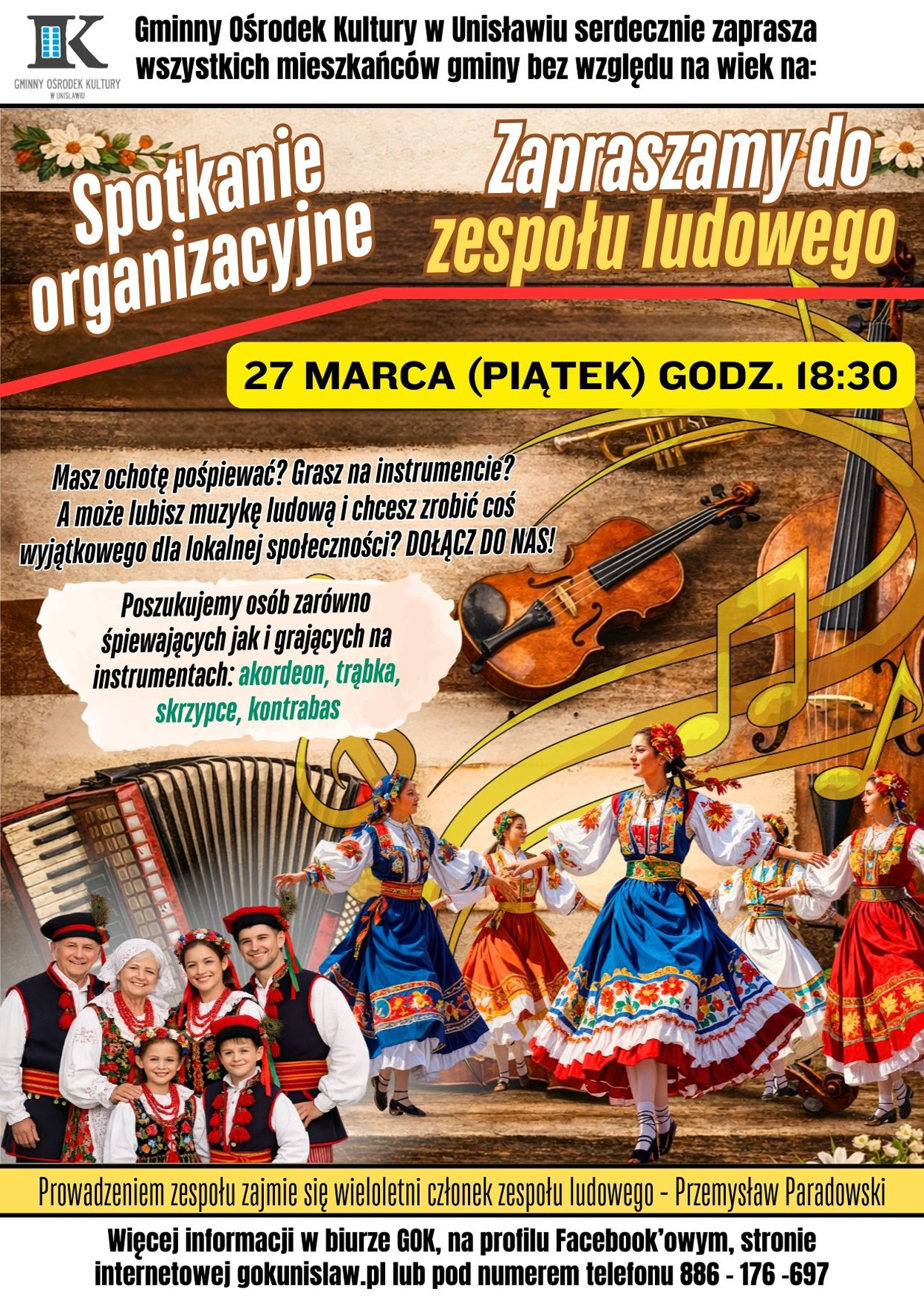 Wraz z wieloletnim członkiem zespołu ludowego – Przemysławem Paradowskim, serdecznie zapraszamy mieszkańców gminy Unisław na spotkanie organizacyjne nowo tworzonego zespołu ludowego Poszukiwane są zarówno osoby śpiewające, jak i grające na instrumentach: akordeon, trąbka, skrzypce i kontrabas – bez względu na wiek! Zespół będzie wykonywał i prezentował repertuar ludowy naszego regionu, pielęgnował i promował piękno lokalnej muzyki i tradycji