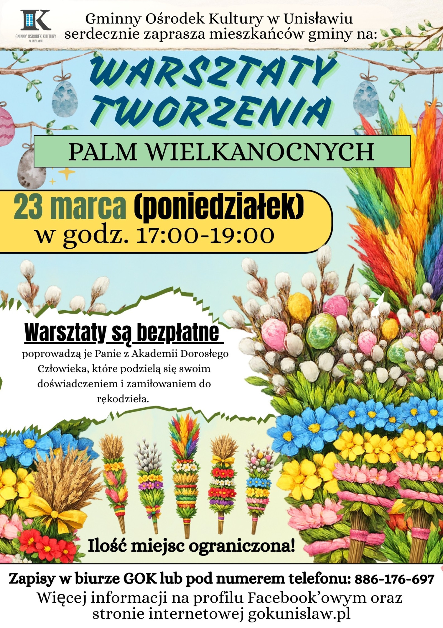 Gminny Ośrodek Kultury w Unisławiu serdecznie zaprasza mieszkańców gminy na bezpłatne warsztaty tworzenia palm wielkanocnych, które odbędą się 23 marca (poniedziałek) w godz. 17:00-19:00.