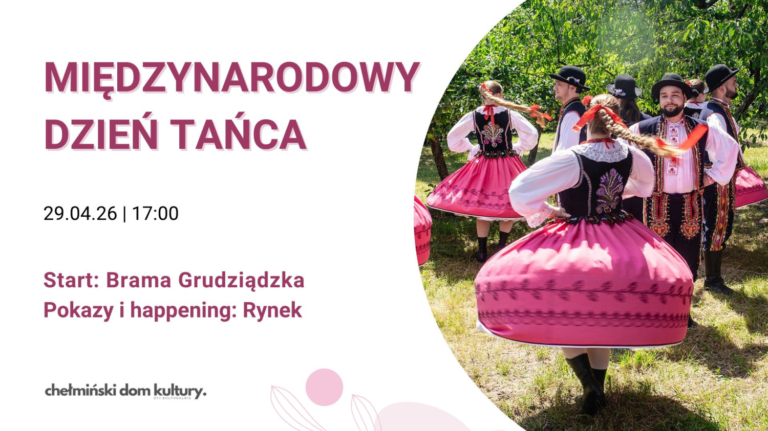 Jak każdego roku – w tym również zapraszamy na wspólny, taneczny przemarsz, od Bramy Grudziądzkiej na Rynek, gdzie odbędą się pokazy grup tanecznych, działających przy Chełmińskim Domu Kultury oraz wspólny happening z Polonezem Chełmińskim w roli głównej