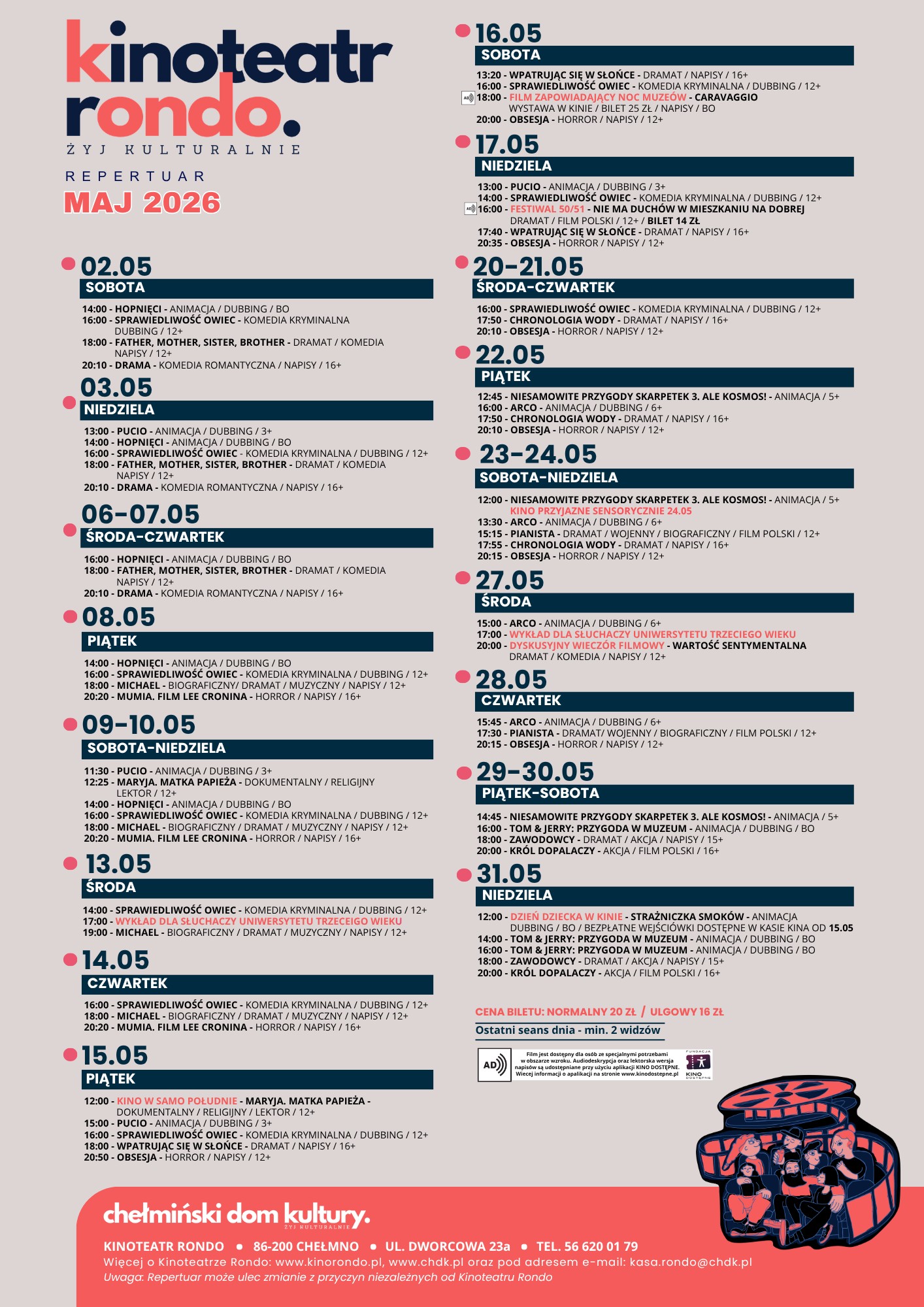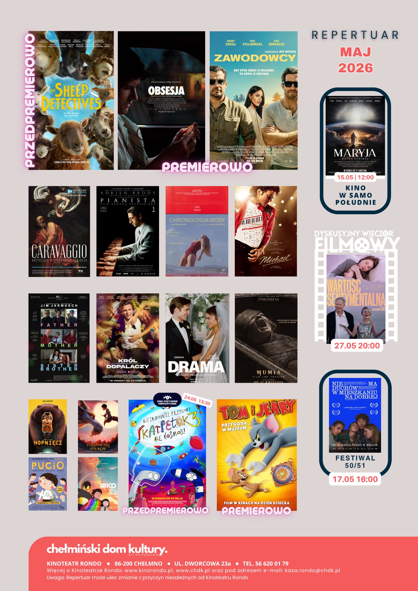 Przed nami miesiąc pełen filmowych emocji i różnorodnych seansów! W majowym repertuarze każdy znajdzie coś dla siebie – od lekkich animacji i filmów familijnych, przez komedie i dramaty, aż po wieczorne kino z dreszczykiem.