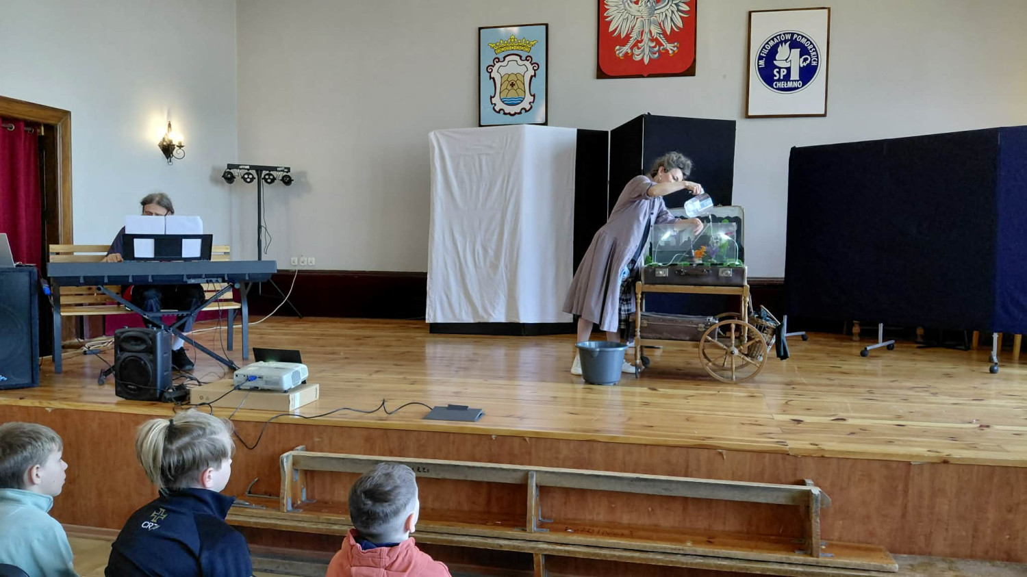 „Kropelka Chełmińska-Plusk" to kameralne przedstawienie z muzyką na żywo, które w przystępny i angażujący sposób przybliża tematykę ochrony środowiska. Spektakl łączy teatr lalek, cieni i przedmiotu, a dzieci aktywnie uczestniczą w działaniach scenicznych. Przygotowało je Stowarzyszenie Teatr Agrafka.