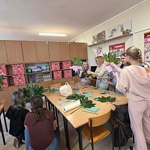 W kwietniu odbyły się wyjątkowe zajęcia bukieciarsko-florystyczne, podczas których młodzież poznawała zasady komponowania dekoracji roślinnych oraz doskonaliła techniki pracy z żywym materiałem florystycznym. Uczniowie wykonywali kompozycje z wykorzystaniem takich roślin jak aralia, ruscus, goździki, chryzantemy oraz delikatna gipsówka. Starannie dobrana kolorystyka – odcienie malinowe, różowe i wrzosowe, przełamane subtelną bielą – nadała aranżacjom elegancki, a zarazem świeży charakter.
