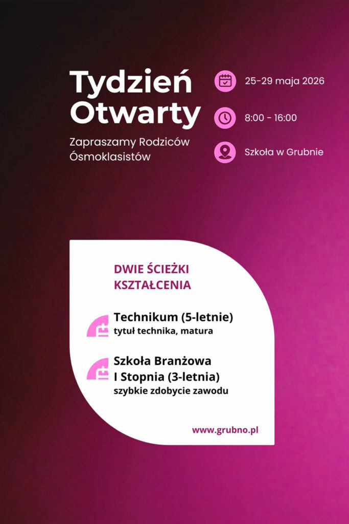Wybór szkoły średniej to moment, w którym warto postawić na konkretne umiejętności. W Zespole Szkół Centrum Kształcenia Zawodowego w Grubnie oferujemy naukę zarówno w technikum, jak i w szkole branżowej, dopasowując ścieżkę edukacji do predyspozycji Państwa dziecka.