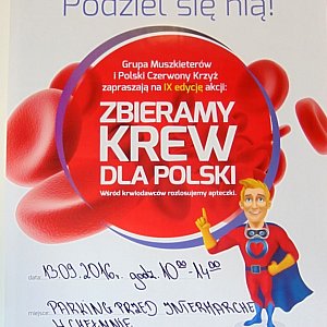 Pod takim hasłem w dniu 13.09.2016 została zorganizowana IX edycja akcji zbierania krwi. Organizatorami corocznej inicjatywy była Grupa Muszkieterów oraz Polski Czerwony Krzyż.
