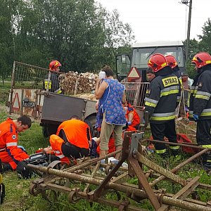 Pierwszy wypadek zdarzył się ok. godz. 11:50. Młoda kobieta podczepiała przyczepę dwukołową do ciągnika i dyszel zmiażdżył jej nogi. Przyczepa była załadowana ok. 3 tonami piachu, co dodatkowo spotęgowało siłę przygniecenia. Przytomnej 34-latce udzielono pierwszej pomocy i śmigłowiec LPR zabrał ją do szpitala w Grudziądzu.