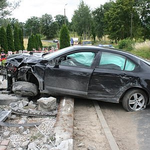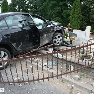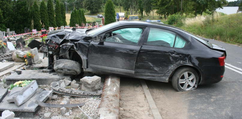 Auto wypadło z drogi na zakręcie i zjechało na przeciwną stronę, taranując ogrodzenie cmentarza. Uszkodzonych zostało kilkanaście nagrobków. Kierująca była trzeźwa, a dwoje pasażerów przewieziono do szpitala, na szczęście nie odnieśli poważnych obrażeń.
