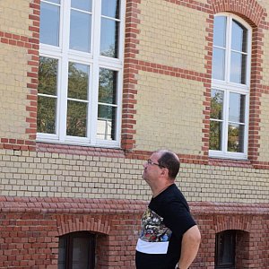 Jako ciekawostkę podam fakt, że główną część budynku prawdopodobnie zbudowano z cegły gorszego gatunku. W porozumieniu z Januszem Gryszanem i Sławkiem Czapiewskim doszliśmy do wniosku, że ze względu na wadliwy produkt budowlany pomalowali cegłę na żółty kolor, żeby budynek wyglądał bardziej okazale. Dobrą cegłą - z różnymi kształtkami - zdobiono obramowania okien i gzyms, w związku z tym bardzo ładnie to wygląda.