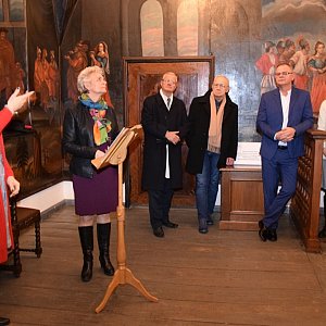 Przybyłych gości serdecznie powitała pani Dyrektor Ewa Gerka, która wraz wykonującą prace naprawcze Aleksandrą Olszewską-Piech opowiedziała historię odnawiania dzieł znajdujących się w Sali Sądowej.