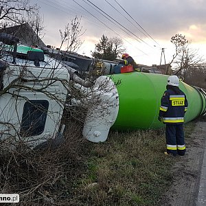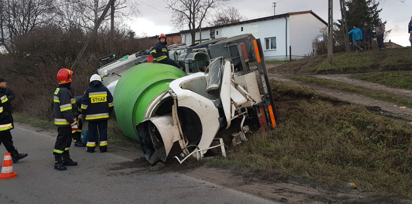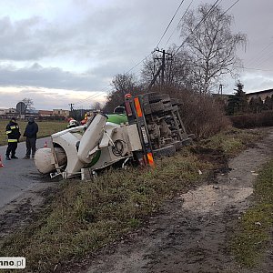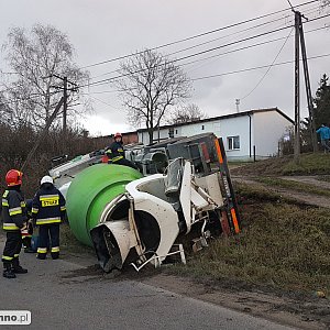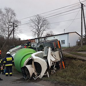 Strażacy zastali samochód ciężarowy marki DAF leżący na boku w przydrożnym rowie, przewożący około 8 metrów sześciennych betonu, masa całkowita pojazdu to 30 ton. Kierowca bez obrażeń znajdował się poza pojazdem. Zabezpieczono miejsce zdarzenia i wyciek paliwa ze zbiornika, odłączono dopływ prądu w pojeździe. Płyny eksploatacyjne zneutralizowano proszkiem pumeksowym. Na miejsce wezwano pomoc drogową. Ze względu na ciężar i usytuowanie pojazdu ustawienie na kołach było niemożliwe. Właściciel firmy przewozowej wezwał na miejsce wypadku dźwig o nośności 40 ton oraz załatwił opróżnienie betoniarki z betonu. Następnie przewrócony pojazd ustabilizowano na kołach przy pomocy dźwigu i pojazdu ciężkiego pomocy drogowej. W międzyczasie policja zorganizowała objazdy. Jezdnia została uprzątnięta i auto przekazano właścicielowi. Akcja trwała około 6 godzin. Straty spowodowane wywrotką betoniarki oszacowano wstępnie na ok. 50 tys. złotych.