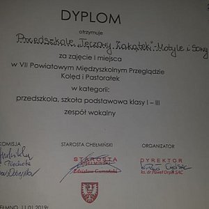 W konkursie kolęd i pastorałek w Katolickiej Szkole Księży Pallotynów dzieci z naszego przedszkola Teczowy Zakatek zdobyly dwa 1 miejsca. W kategorii zespół wygrały 6 - latki z grup Sowy i Motyle oraz 4 - letnia solistka z grupy Mrówki Oliwia Ernestowicz. Jesteśmy dumni z naszych przedszkolaków.
