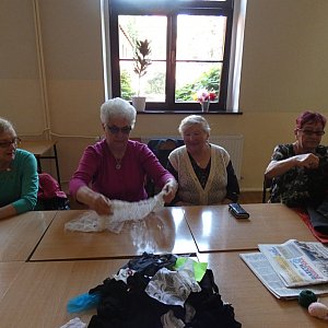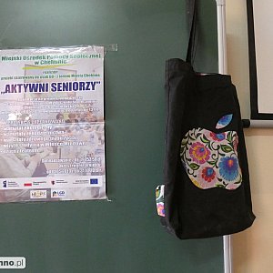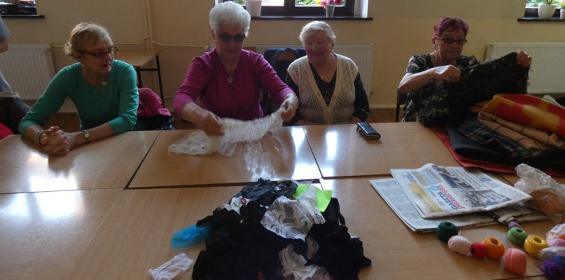 2. Warsztat praktyczny, podczas którego seniorzy samodzielnie mieli okazję przetworzyć po raz wtórny niepotrzebne stare ubrania i wykonali z nich torby na zakupy.