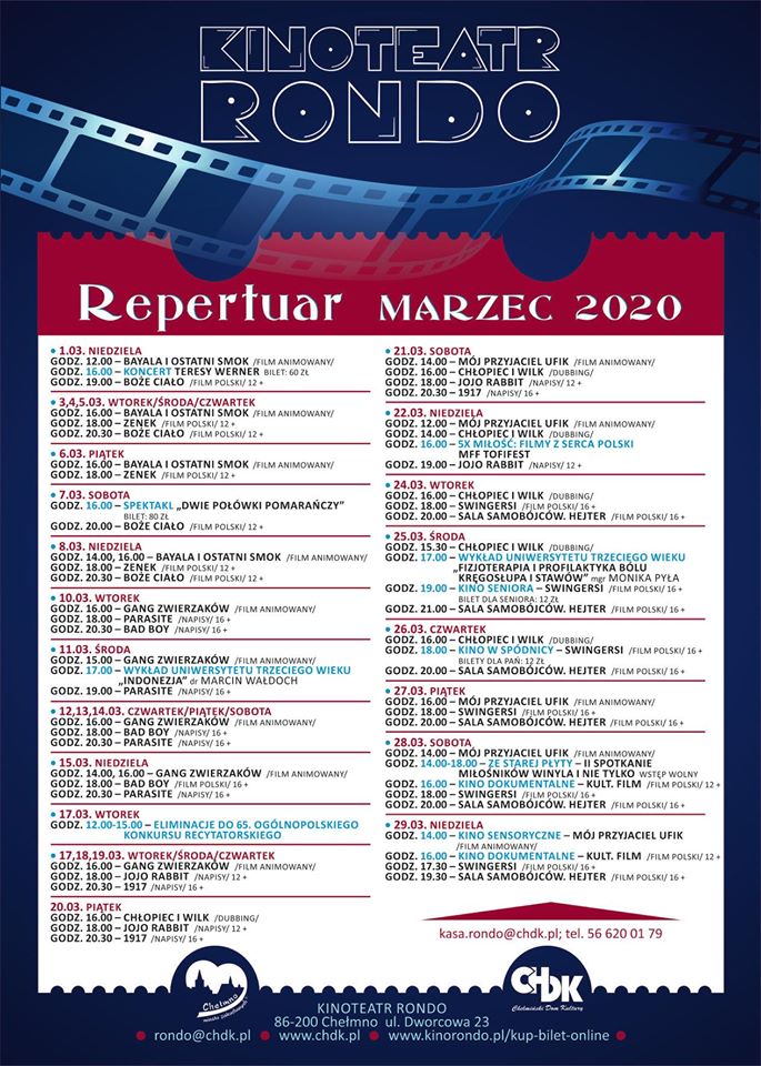 Zapraszamy do zapoznania się z repertuarem na marzec 2020. Zapewne każdy znajdzie coś interesującego dla siebie. Twoje dziecko się nudzi? A może TY masz wolny wieczór? Przybywajcie do kinoteatru Rondo.