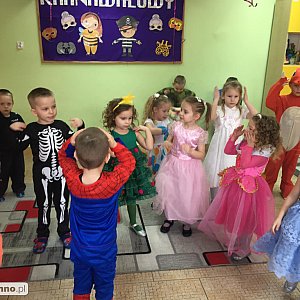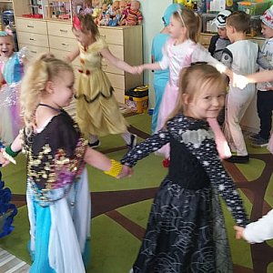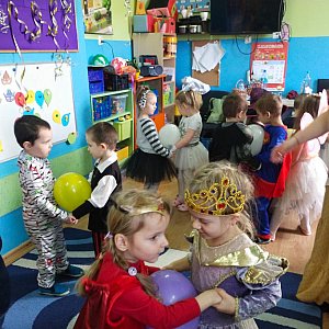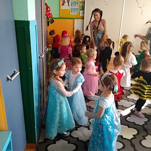 W tym dniu do przedszkola przychodziły kolorowe postacie. Dzieci przebrane były za bohaterów znanych bajek, w salach przedszkolnych można było spotkać wróżki, królewny, księżniczki, motylki, rycerzy, piratów, policjantów, żołnierzy, ... nie sposób zliczyć i wymienić tych wszystkich postaci. Sale były pięknie ozdobione, wystrój wprowadzał w radosny nastrój oraz zachęcał wszystkich do wesołej zabawy. Ze względu na sytuację epidemiologiczną , każda grupa bawiła się w swojej sali. Nie mogliśmy jak co roku zaprosić wodzireja, który poprowadziłby bal , lecz panie nauczycielki bardzo fajnie poradziły sobie z zachęceniem przedszkolaków do zabawy poprzez przygotowanie konkursów, gier oraz muzyki, która była skoczna i rytmiczna.