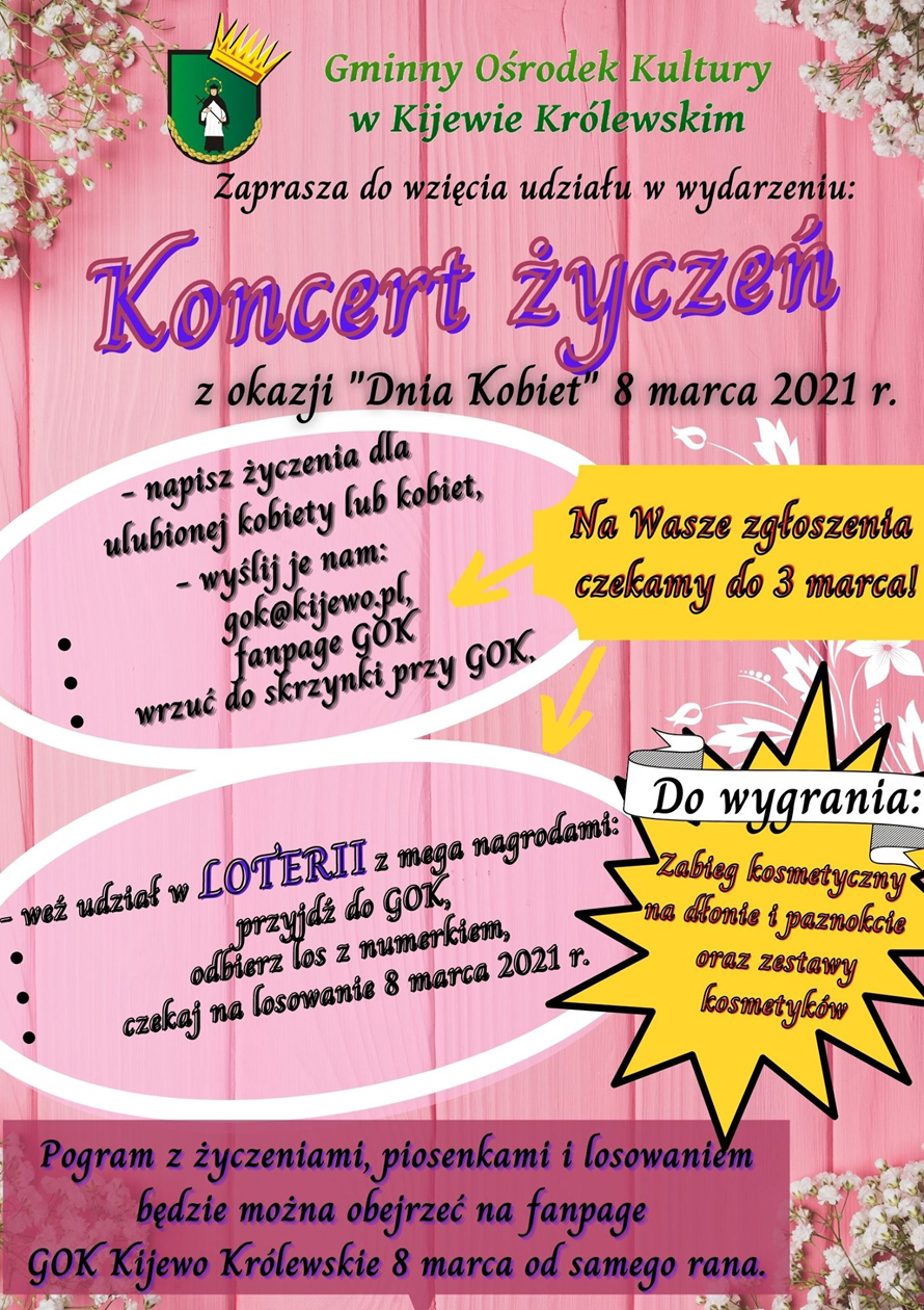 Zbliża się Dzień Kobiet i chcielibyśmy Was zaprosić do wzięcia udziału w Koncercie Życzeń. Do 3 marca czekamy na życzenia od wszystkich, którzy chcieliby przekazać je Paniom, umieścimy je pomiędzy piosenkami.