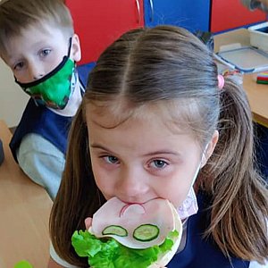 W pierwszej klasie uczymy się wielu nowych nawyków i zasad. Ponieważ często zapomina się o tym co najważniejsze dla ciała, czyli o energii płynącej ze zdrowego śniadania, nasi najmłodsi uczniowie wraz z Panią Ewą przypomnieli sobie i nam o tym, jak powinno wyglądać takie dobre i zdrowe śniadanko.