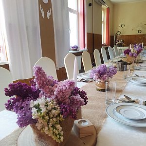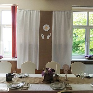 W ubiegłym tygodniu swoje wiadomościami i umiejętnościami mogli zaprezentować uczniowie klasy III technikum architektury krajobrazu, przygotowując kompozycje bukieciarskie oraz aranżując wystrój sali konferencyjnej na uroczystość I Komunii Świętej. Uczniowie przygotowali wystrój w stylu eko, który charakteryzuje się harmonią i spokojem kompozycji. Styl ekologiczny w aranżacji wnętrz jest mocno powiązany z ideologią, którą staramy się kierować się na co dzień, a także stylem życia. Chodzi w nim o dążenie do harmonii oraz maksymalne wykorzystanie dobrodziejstw przyrodniczych – bez szkód dla środowiska. Zastosowana kolorystyka, ograniczona została do minimalnej ilości barw, tak aby na pierwszy plan wysunęły się różnorodne faktury. Dominującymi kolorami jest paleta jasnych beżów i bieli, które jest zauważalne w materiałach wykorzystanych do dekoracji sali i bieliźnie stołowej.