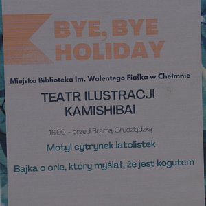 W ramach obchodów BYE, BYE HOLIDAY Miejska Biblioteka Publiczna w Chełmnie przygotowała 28.08 o godz. 16:00 przed Bramką Grudziądzką specjalne przedstawienie. Był to Teatr Ilustracji KAMISHUBAI i opowiastka dla dzieci "Motyl cytrynek latolistek. Bajka o orle, który myślał, że jest kogutem".