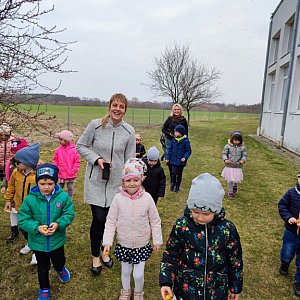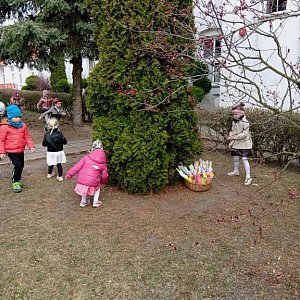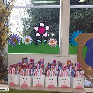 Jak co roku przed świętami Wielkiej Nocy do przedszkola przychodzi zajączek i w tajemniczy sposób zostawia prezenty. Dzieci czekały na niego z niecierpliwością. Każdy przedszkolak szedł śladami małych kolorowych jajeczek, które prowadziły do kosza słodkości.