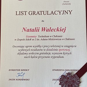 Stypendium za osiągnięcia naukowe przypadło Wiktorii Narolskiej z klasy IV TE/TR. Za dokonania sportowe nagrodzone zostały trzy osoby: Natalia Walecka z klasy III TR, Jakub Kruszyński z II TR i Jacek Kułakowski z IV TI.