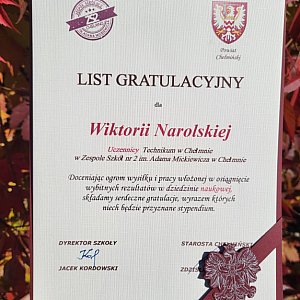 W dniu dzisiejszym, 6 października, Pani Dorota Ćwik, Naczelnik Wydział Oświaty, Zdrowia, Kultury i Sportu Starostwa Powiatowego w Chełmnie, w imieniu Starosty Zdzisława Gamańskiego wręczyła stypendia najlepszym uczniom ZS2.