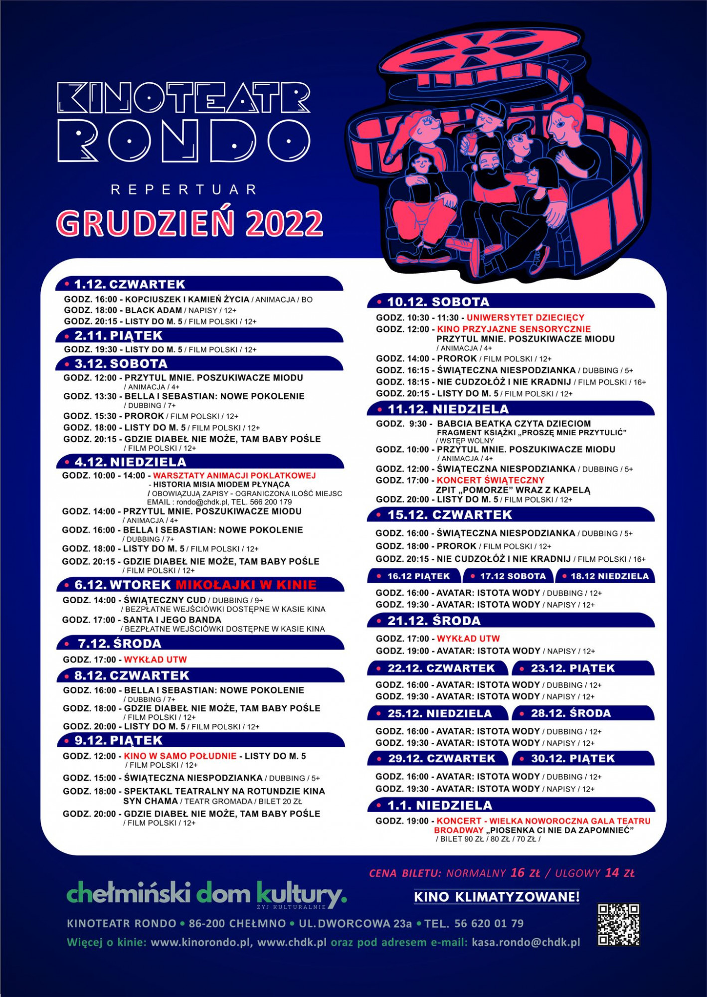 Grudniowy repertuar Kinoteatr RONDO, a w nim m.in. :PREMIEROWO  film "AVATAR: ISTOTA WODY" - ZAPRASZAMY !