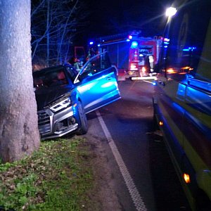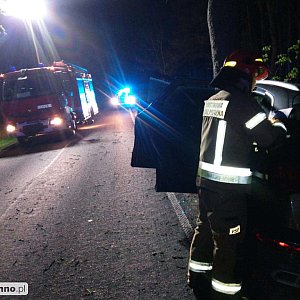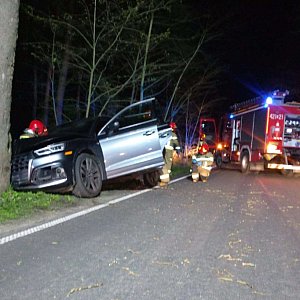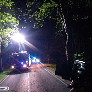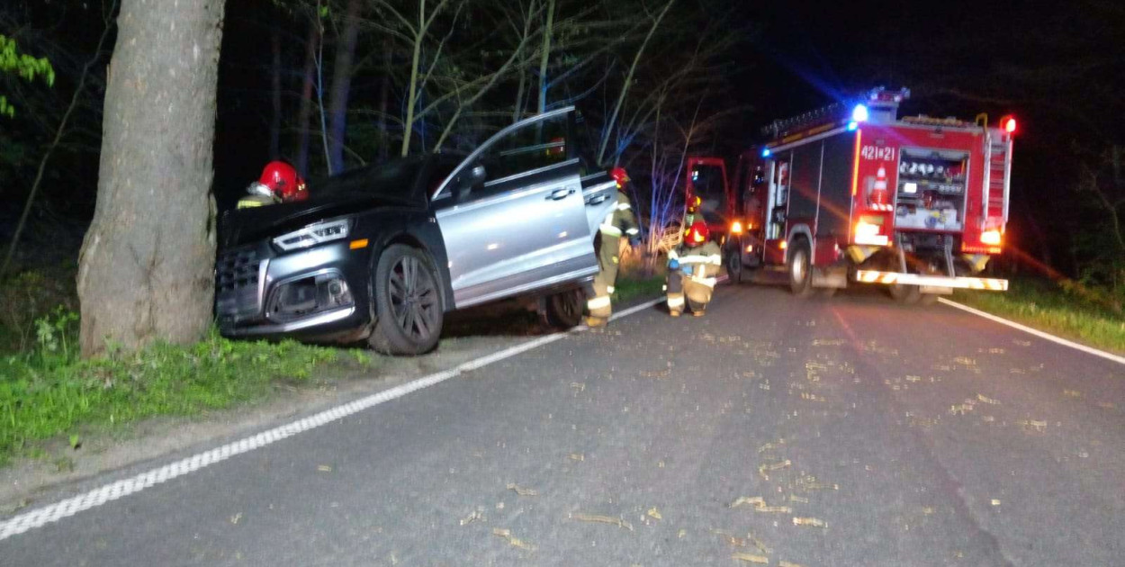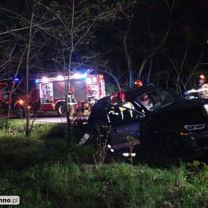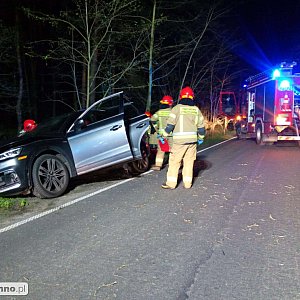 Na miejscu zdarzenia zastano samochód osobowy marki Audi po uderzeniu czołowym w drzewo. Dwie osoby poszkodowane znajdowały się poza pojazdem. Kobieta lat 39 była przytomna, bez widocznych obrażeń. Uskarżała się na ból w klatce piersiowej. Mężczyzna lat 40 był również przytomny, bez widocznych obrażeń, zgłaszał ból kręgosłupa. Nie było dodatkowych zagrożeń.