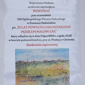 3 lipca br. Starosta Chełmiński Zdzisław Gamański oraz Zastępca Wójta Gminy Chełmno Marcin Pilarski dokonali uroczystego otwarcia wystawy prac artystów uczestniczących w XIII Ogólnopolskim Plenerze Malarskim w Powiecie Chełmińskim pn.: „25 lat Powiatu Chełmińskiego pędzlem malowane”.