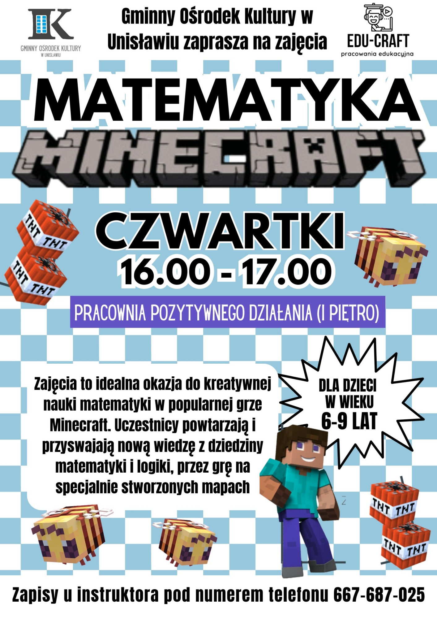 Gminny Ośrodek Kultury w Unisławiu wraz z Edu – Craft serdecznie zapraszają dzieci w wieku 6-9 lat na zajęcia Matematyki Minecraft, które będą się odbywać cyklicznie w czwartki w godzinach 16:00 – 17:00 (I piętro – Pracownia Pozytywnego Działania).