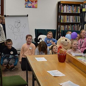 Po przeczytaniu wszystkich bajek przyszedł czas na zagadki. Pociechy rozwiązywały krzyżówki przygotowane przez Panie Bibliotekarki, które dotyczyły znanych misiów lub postaci z bajek i filmów. Dzieciaki dały porwać się wirowi zgadywania haseł, ukrytych za zagadkami oraz zadawały wiele pytań. Następnie rozpoczęła się gra w kalambury. Po rozdaniu kopert z obrazkami dzieci pojedynczo wychodziły na środek i przedstawiały swoje postacie. Po odgadnięciu przyczepiały je na tablicę. Na koniec odbyło się wspólne rysowanie misia i cała grupa zrobiła sobie również pamiątkowe zdjęcie.