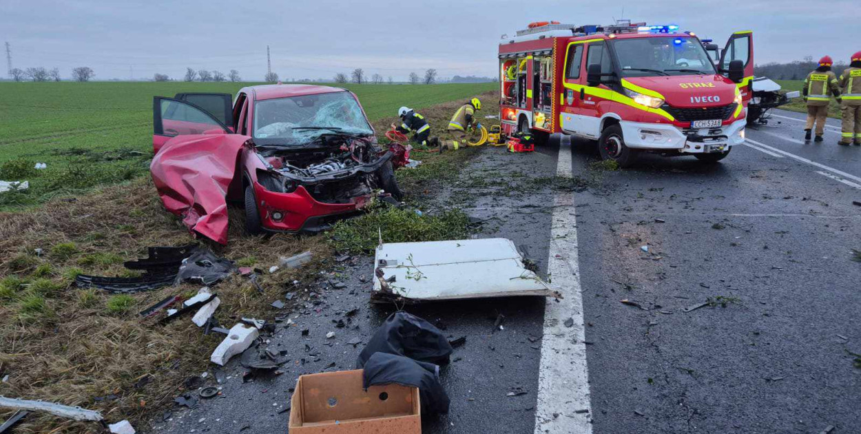 Strażacy musieli pociąć sprzętem hydraulicznym wrak jednego z aut, aby wydostać z niego ranną kobietę. Dwie poszkodowane osoby trafiły do szpitala - kierujący volkswagenem 62-latek i 57-latka z mazdy CX5. Działania trwały 1,5 godziny i  tym czasie przejazd drogą był zablokowany.