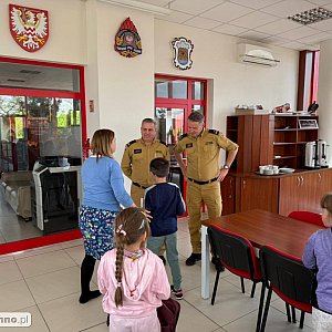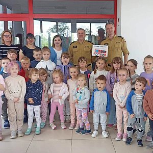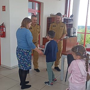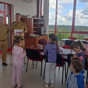 Przywitali nas Komendant Powiatowy mł. bryg. mgr Tomasz Guzek oraz Zastępca Komendanta mł. bryg. mgr inż. Artur Tokarczyk. Na ich ręce przekazaliśmy laurkę wykonaną przez dzieci – z serdecznymi życzeniami dla wszystkich funkcjonariuszy.