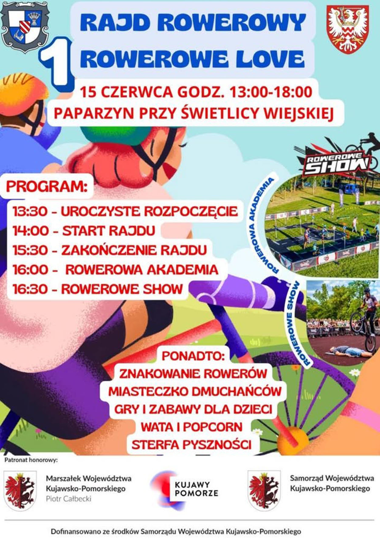 1. RAJD ROWEROWY “ROWEROWE LOVE” - 15 czerwca 2025 r. (niedziela) godz. 13:00–18:00: Paparzyn – przy świetlicy wiejskiej. Rodzinna niedziela na dwóch kółkach? TAK!