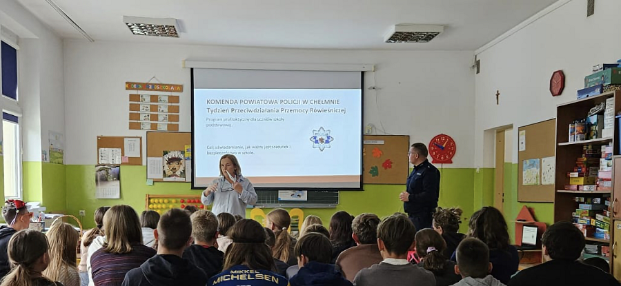 W ramach ogólnopolskich działań profilaktycznych pod hasłem "Tydzień przeciwdziałania przemocy rówieśniczej" policjanci z Komendy Powiatowej Policji w Chełmnie prowadzą spotkania edukacyjne z uczniami szkół na terenie powiatu. Mundurowi zwracają szczególną uwagę na bezpieczeństwo młodych ludzi oraz budowanie postaw opartych na wzajemnym szacunku i odpowiedzialności.