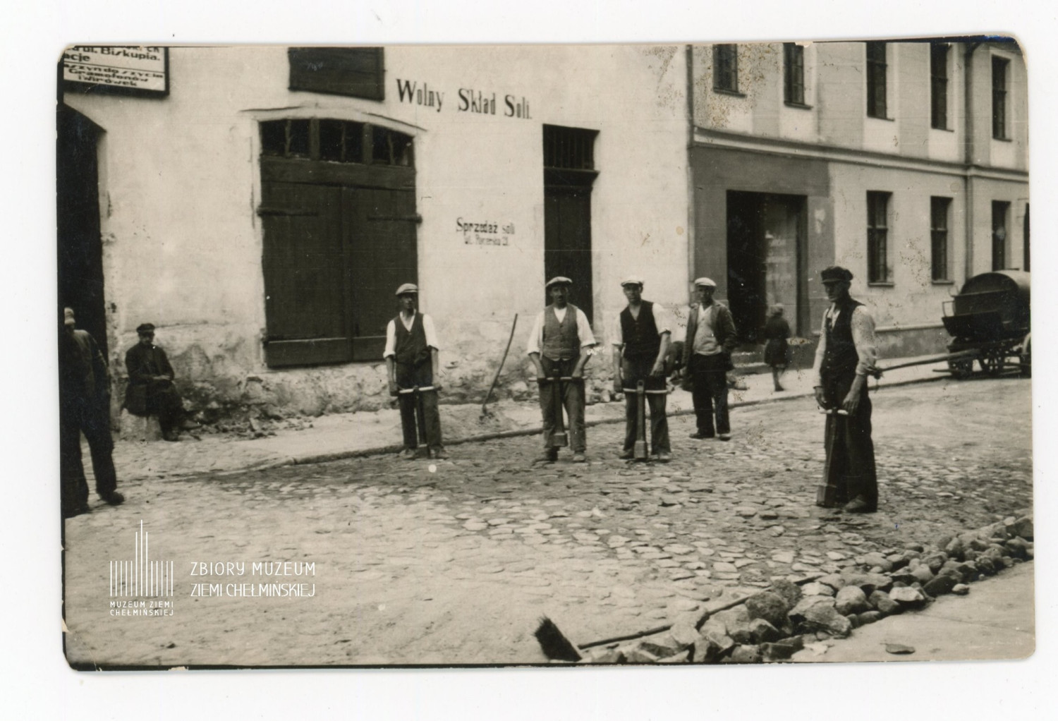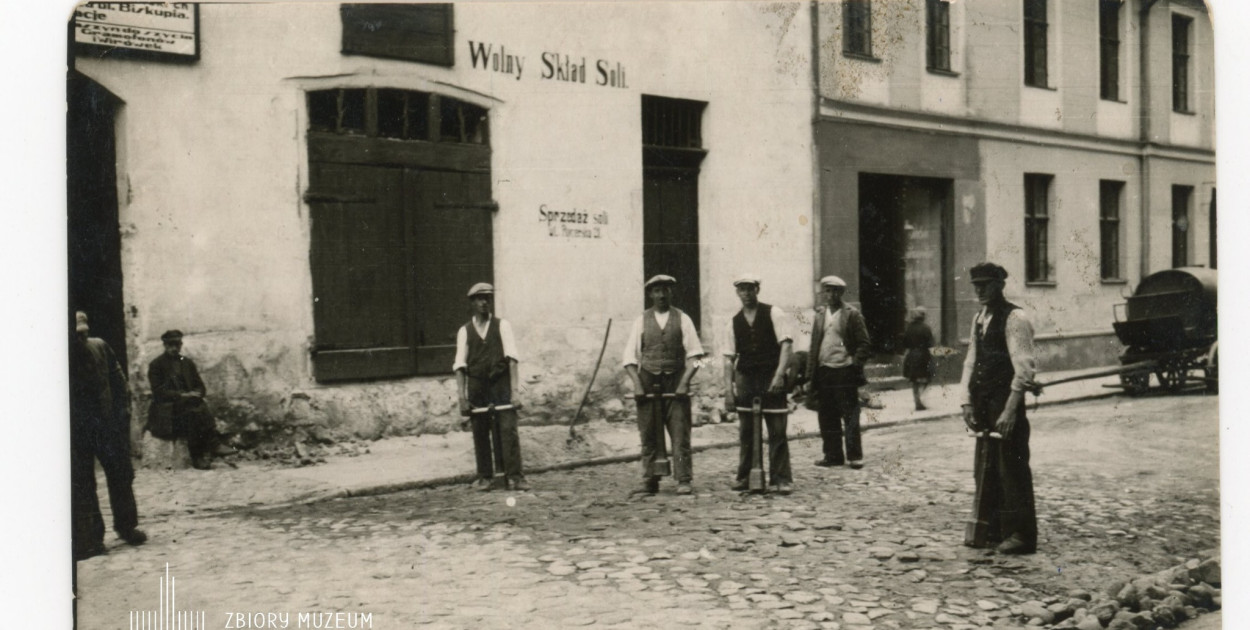 Pozostałe ulice miały nawierzchnię z kamienia polnego. Co jakiś czas należało nawierzchnię naprawić i dokonać przełożenia. Takie prace były prowadzone ok.1931 roku m.in. przy ulicy Biskupiej w Chełmnie. Na fotografii widzą Państwo robotników w czasie pracy, a w tle budynek spichlerza w którym w okresie międzywojennym funkcjonował Skład Soli. Obecnie Restauracja Spichlerz.