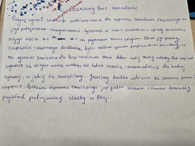 Do Komendanta Powiatowego Policji w Chełmnie wpłynęło podziękowanie za profesjonalizm, zaangażowanie i życzliwość kierownika ogniwa patrolowo-interwencyjnego asp. Sławomira Chacińskiego. Autorka listu zwróciła uwagę na wysoki poziom empatii i cierpliwości, jakie wykazał funkcjonariusz podczas prowadzonych działań. Dzięki jego wsparciu, możliwe było sprawne przeprowadzenie ważnej procedury związanej z leczeniem członka rodziny, co miało istotne znaczenie dla bezpieczeństwa i dobra całej rodziny.