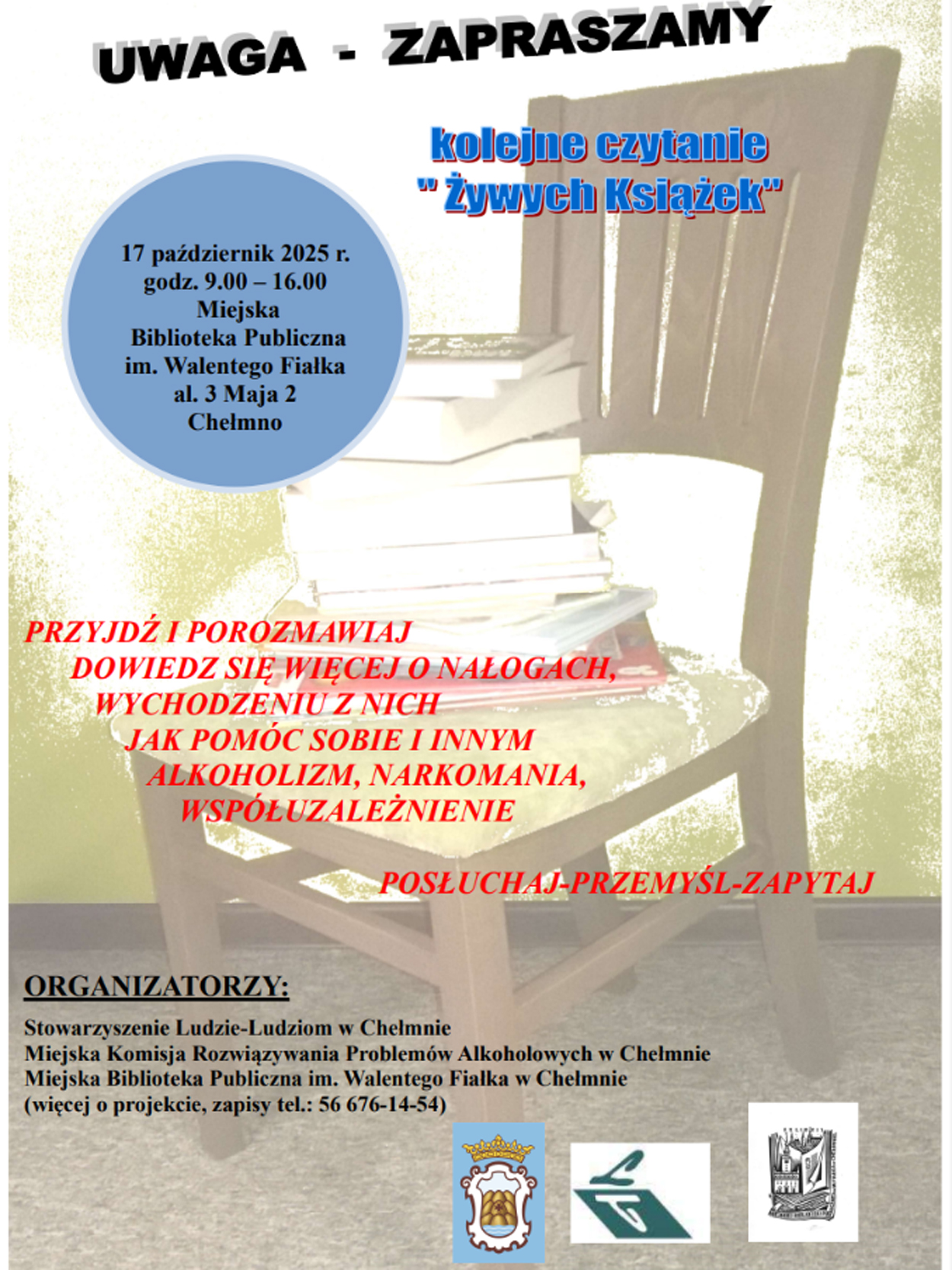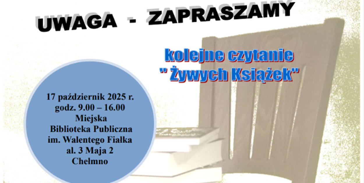 Tradycyjnie we współpracy z Miejską Komisją Rozwiązywania Problemów Alkoholowych i Stowarzyszeniem Ludzie-Ludziom zapraszamy do udziału w profilaktycznej akcji czytania „Żywych Książek”. Wydarzenie będzie miało miejsce 17 października 2025 roku w Miejskiej Bibliotece Publicznej im. Walentego Fiałka w Chełmnie od godziny 9.00 do 16.00.