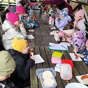 Na zakończenie wszyscy odpoczęli przy ognisku , zajadając pyszne kiełbaski .