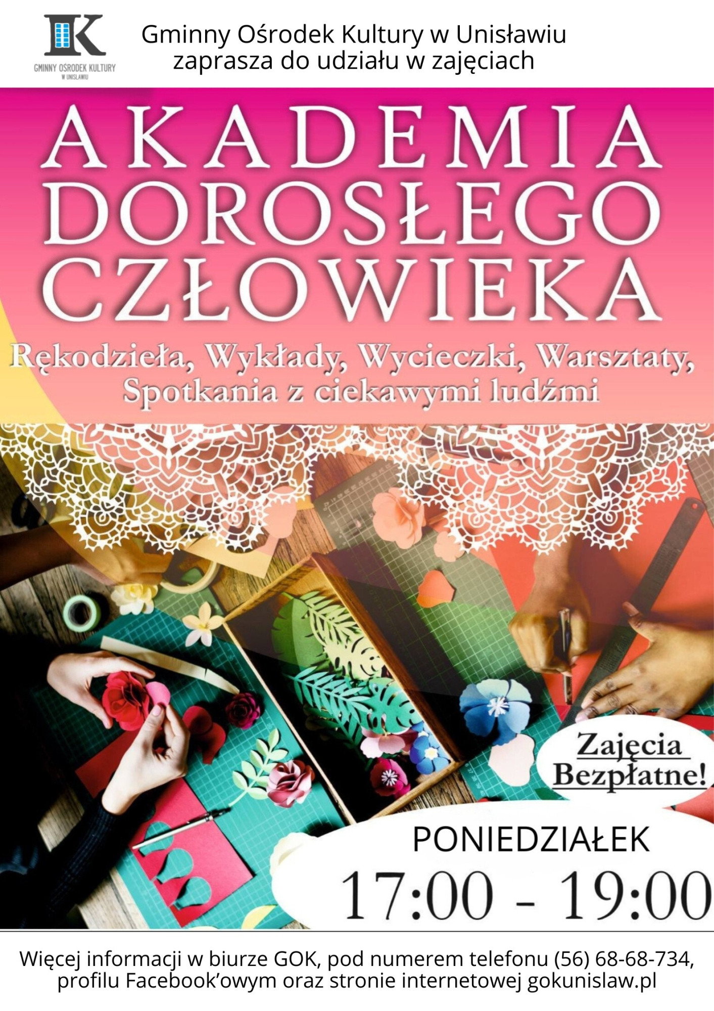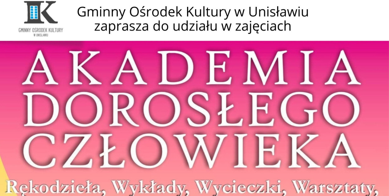 Gminny Ośrodek Kultury w Unisławiu zaprasza dorosłych uczestników do udziału w bezpłatnych zajęciach rękodzielniczych pn. Akademia Dorosłego Człowieka, które będą się odbywały cyklicznie w poniedziałki w godz. 17:00 – 19:00.