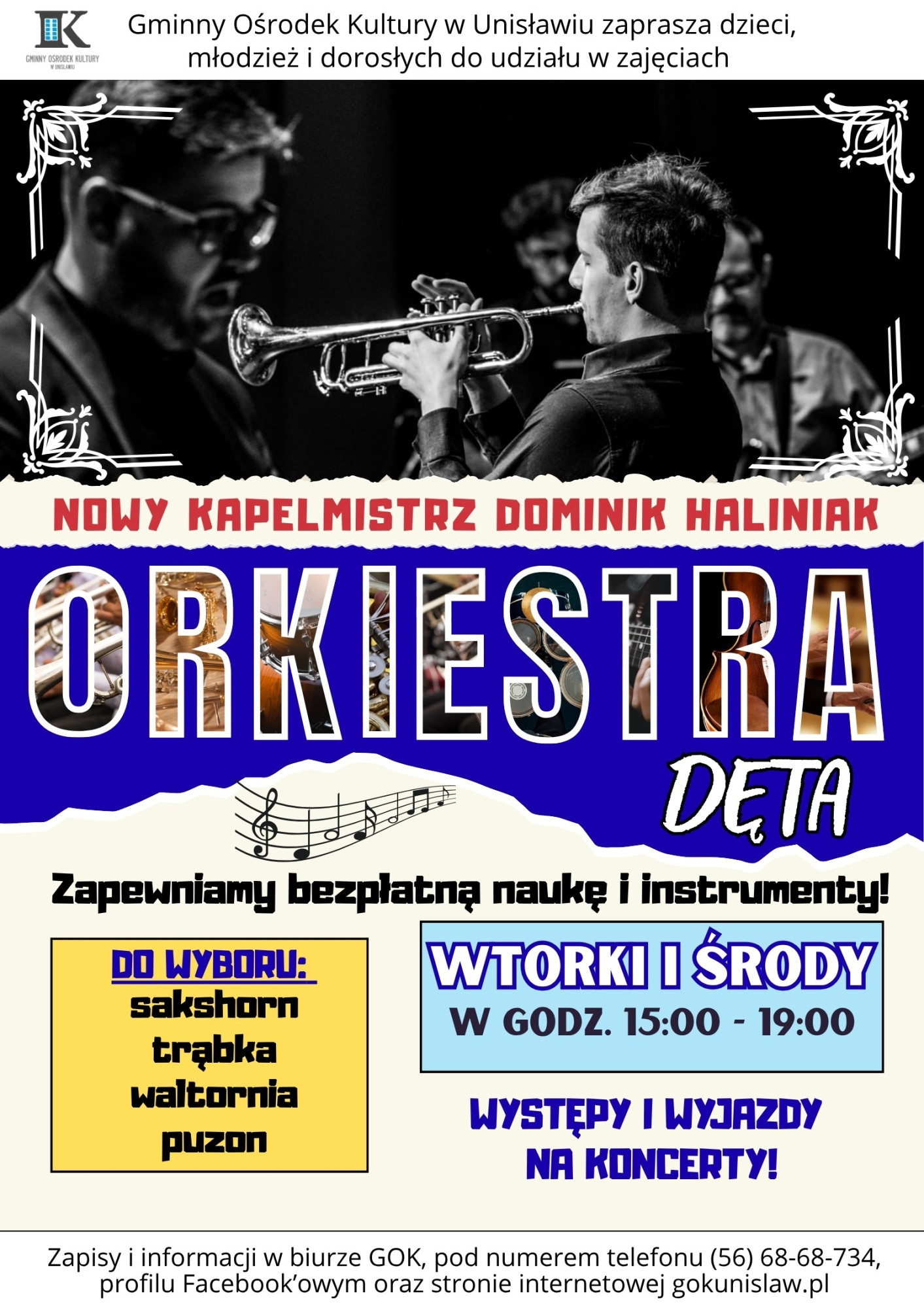 Orkiestra dęta kontynuuje swoje działania! Gminny Ośrodek Kultury w Unisławiu wraz z nowym kapelmistrzem Dominikiem Haliniakiem zapraszają dzieci, młodzież i dorosłych na bezpłatną naukę gry na instrumentach. Orkiestra dęta, działająca nieprzerwanie od 26 lat, zaprasza Cię do wspólnej zabawy i twórczości! Instrumenty do wyboru: sakshorn, trąbka, waltornia oraz puzon.