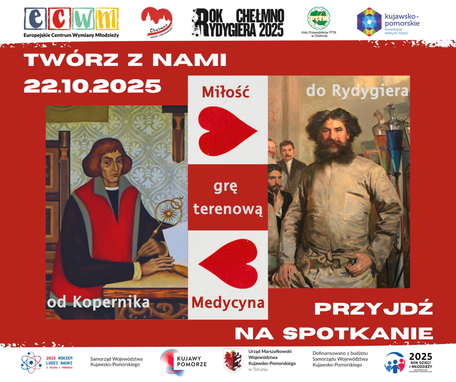 Zaproszenie na spotkanie i wspólne tworzenie gry terenowej „Miłość i Medycyna – od Kopernika do Rydygiera”. Fundacja „Europejskie Centrum Wymiany Młodzieży im. Kurta Schumachera w Chełmnie” i Urząd Miasta Chełmna serdecznie zapraszają na spotkanie i wspólne tworzenie gry terenowej pt. „Miłość i Medycyna – od Kopernika do Rydygiera”.