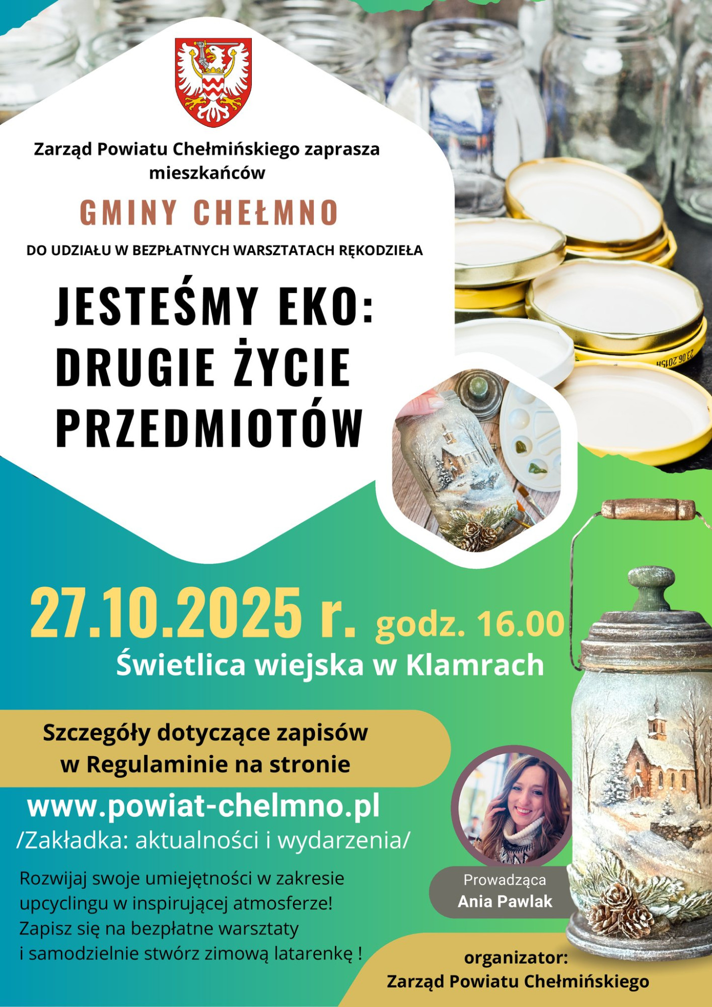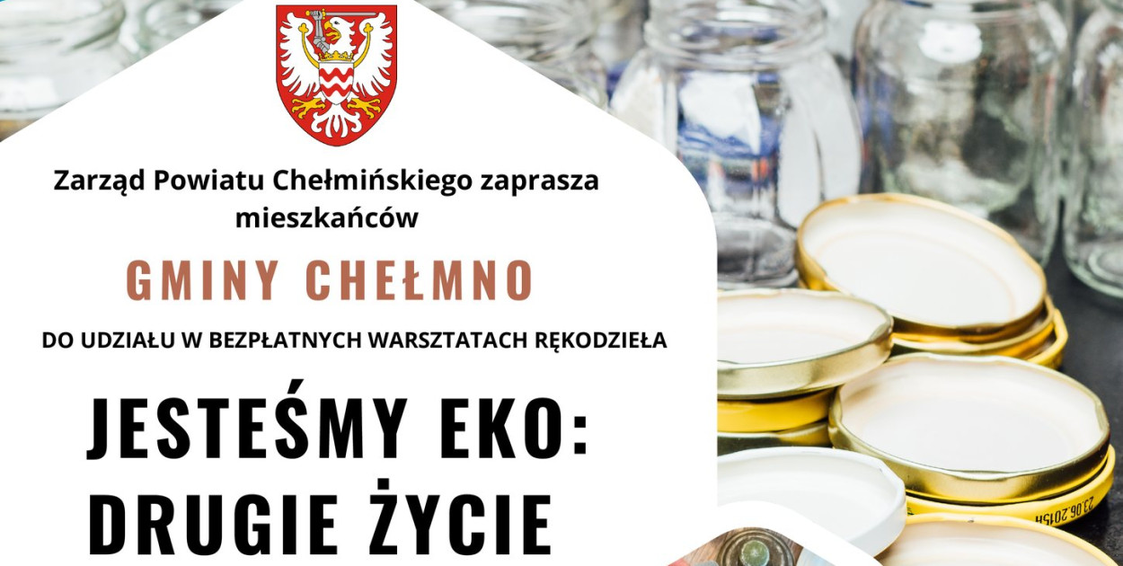 Ogłaszamy nabór uczestników z terenu gminy Chełmno do udziału w bezpłatnych w warsztatach rękodzieła w ramach inicjatywy „Jesteśmy Eko: Drugie życie przedmiotów” organizowanych przez Zarząd Powiatu Chełmińskiego.