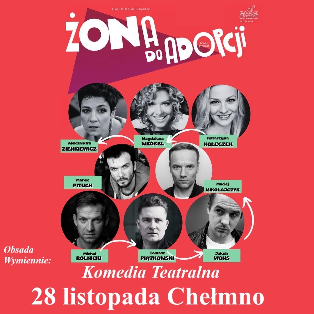 28 listopada w Chełmnie zobaczymy genialną , wyjątkowo zabawną komedię teatralną " Żona do Adopcji". Aktorzy znani z seriali telewizyjnych rozbawią Nas do łez !!!Komedia to mało powiedziane!!!