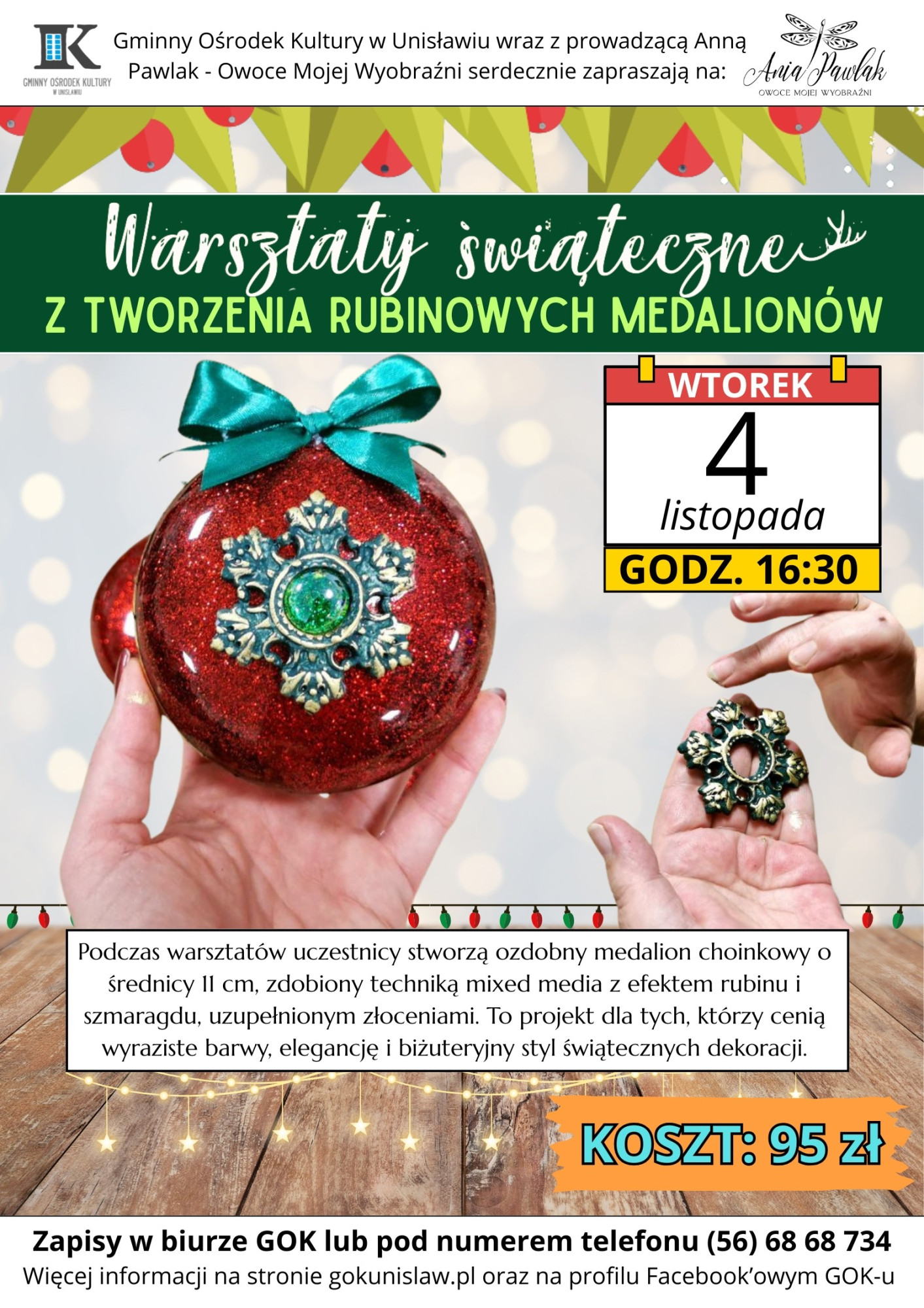 Gminny Ośrodek Kultury w Unisławiu wraz z prowadzącą Owoce Mojej Wyobraźni - Ania Pawlak, serdecznie zapraszają dorosłych na świąteczne warsztaty tworzenia rubinowych medalionów. Kreatywne spotkanie odbędzie się we wtorek, 4 listopada o godz. 16:30. Koszt udziału wynosi 95 zł.