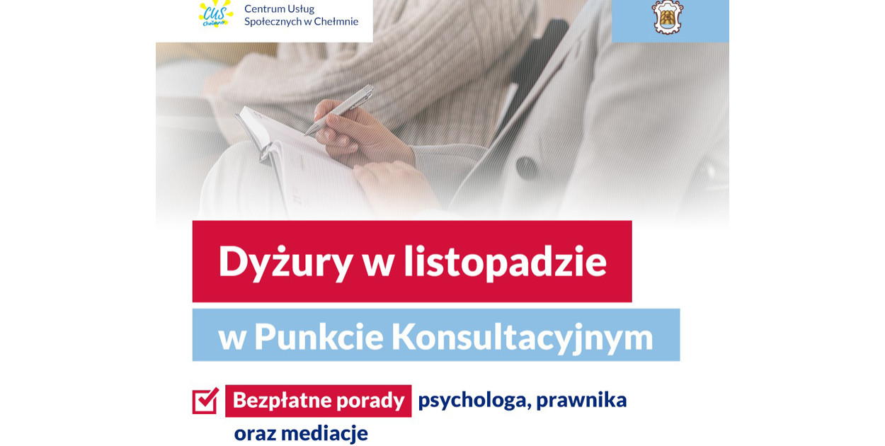 Potrzebujesz wsparcia psychologa, prawnika lub pomocy w rozwiązaniu konfliktu? Centrum Usług Społecznych zaprasza mieszkańców Chełmna do skorzystania z bezpłatnych porad w Punkcie Konsultacyjnym przy ul. Hallera 11.
