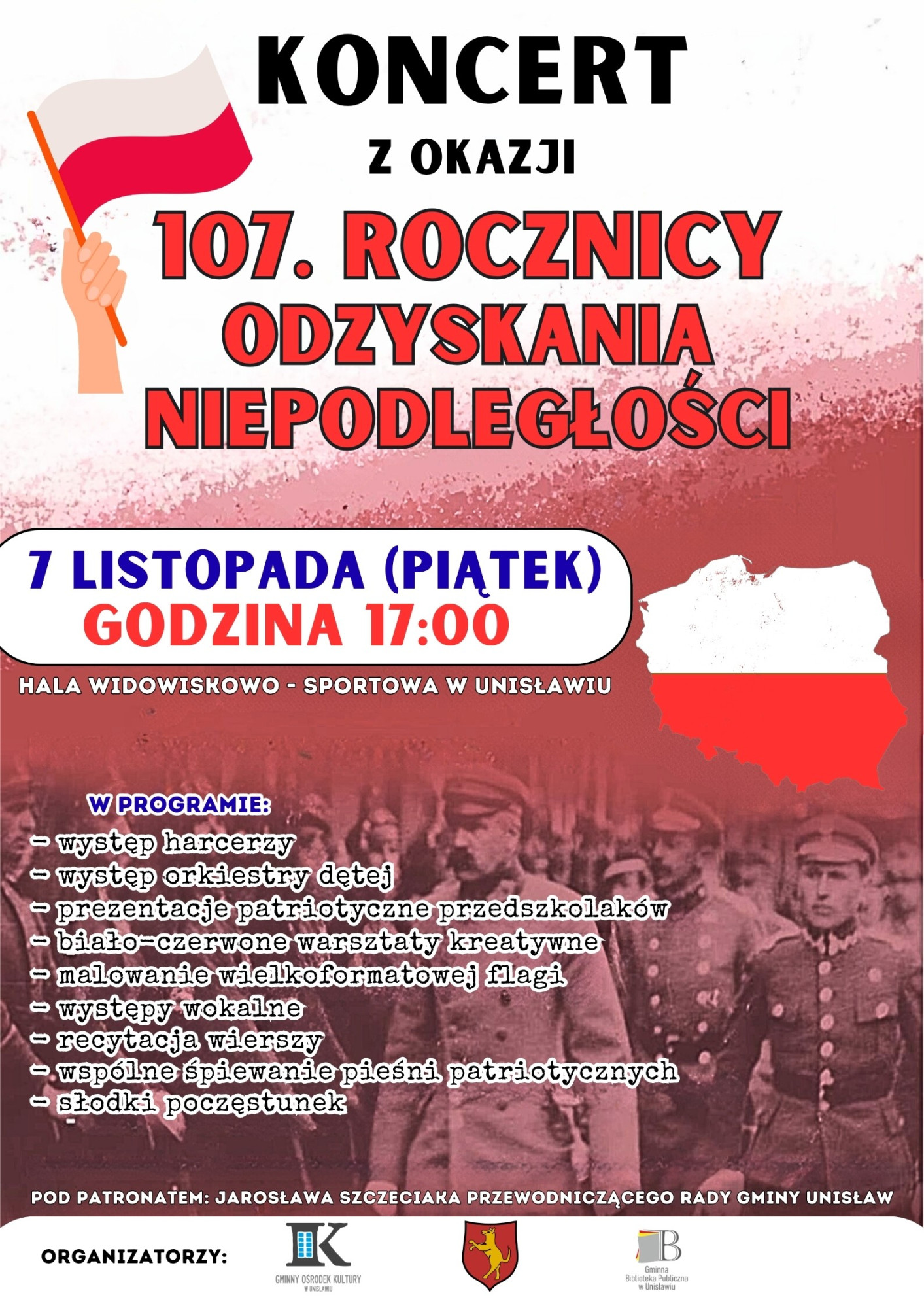 Wydarzenie swym patronatem objął Przewodniczący Rady Gminy w Unisławiu Pan Jarosław Szczeciak. W programie: występ harcerzy, koncert orkiestry dętej, prezentacje patriotyczne przedszkolaków, występy wokalne, biało - czerwone warsztaty kreatywne, recytacje wierszy, wspólne śpiewanki patriotyczne oraz słodki poczęstunek. Liczymy na Waszą obecność!