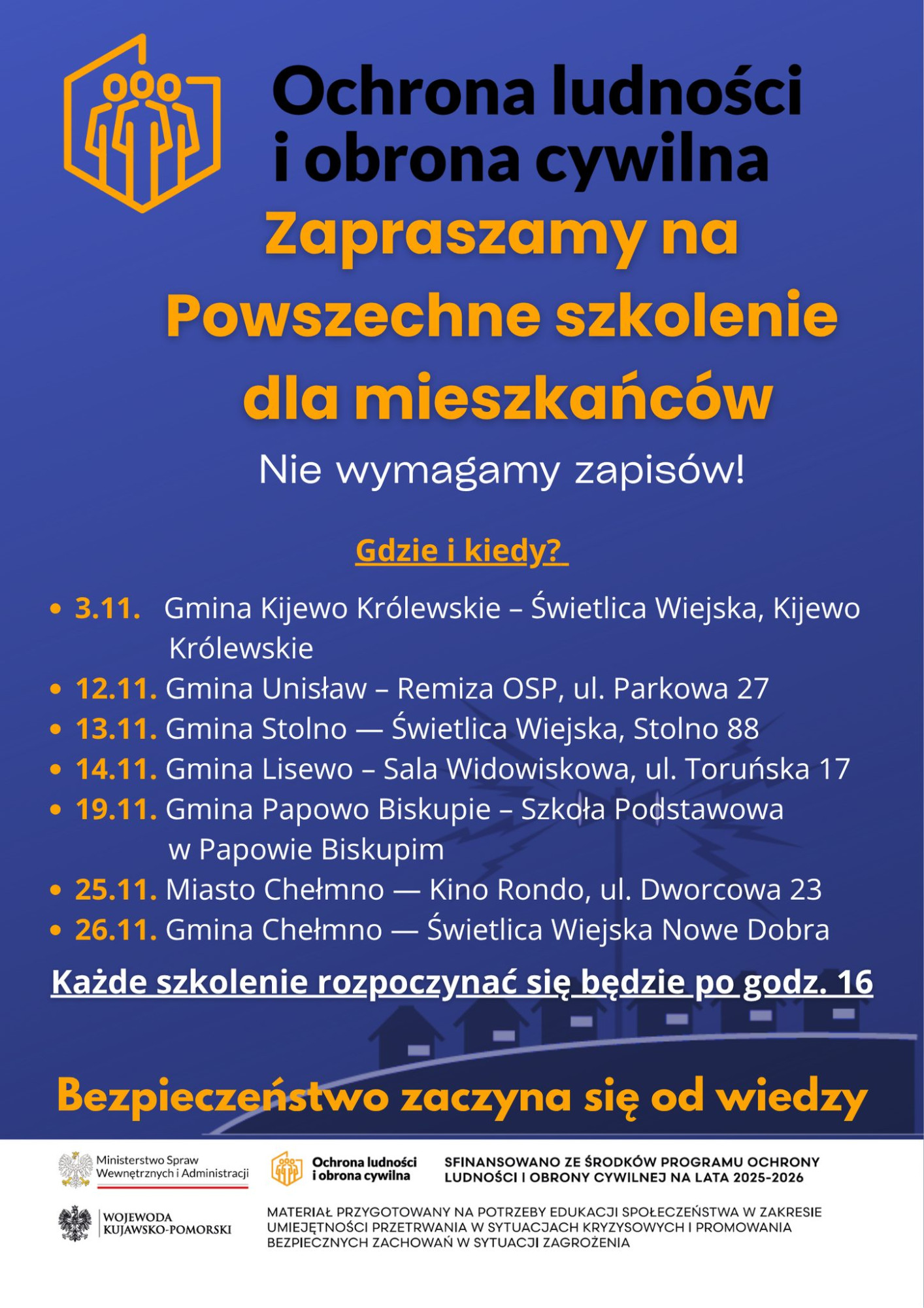 Szkolenie jest darmowe i nie wymaga rejestracji. Powiat Chełmiński organizuje je w ramach Programu Ochrony Ludności i Obrony Cywilnej na lata 2025-2026.